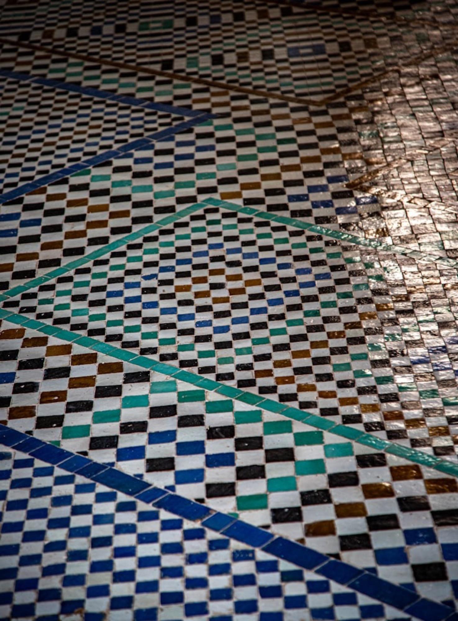 « J’ai été immédiatement captivé par les motifs géométriques qui habillent mosquées, riads et palais », écrit Ariel Cohen, en évoquant ces mosaïques façonnées à la main — le zellige — qui donnent à l’architecture marocaine son rythme visuel. À Fès comme à Marrakech, les carreaux guident le regard le long des cours, des fontaines et des parois voûtées, où la couleur et la répétition organisent l’espace.